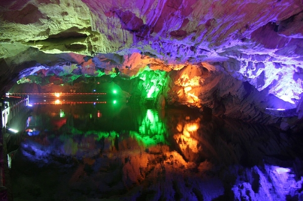 坐在船中,看河水清澈晶瑩,溪中怪石嶙峋,氣象萬千,或如蛟、或如鱉、或如龜、或如鳥、或如象,在五彩的燈光下,色彩斑斕,形態(tài)華肖;更有龍舞蛟騰、紫電飛空、金霞生輝的特殊水中世界,撩人遐思神往。