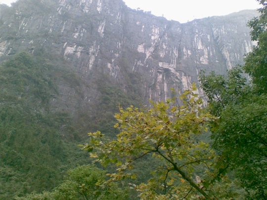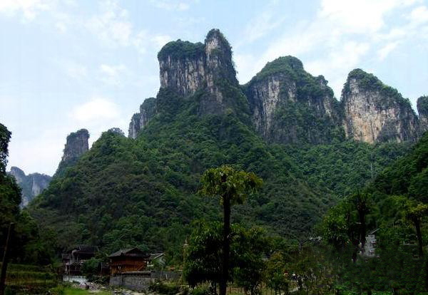 從玉鉆峰沿公路向北行2公里,但見溪谷兩岸石壁陡峭如削,高千仞,絕壁間石紋如,青白相間,加上有古木翠草點綴,如同屏。這就是“天門壁”。走過“天門壁”,便見三座石峰緊緊相連,這就是“相依巖”。高200余米,活象三個石人相依而立,靠前的一個是頭戴銀花首飾、身著百褶花羅裙的苗姑,緊靠后的一個是頭纏花帕、身穿對襟短衣的苗族男子,靠左的一個是頭纏絲帕、身著胸襟式土布衣的老媒人。