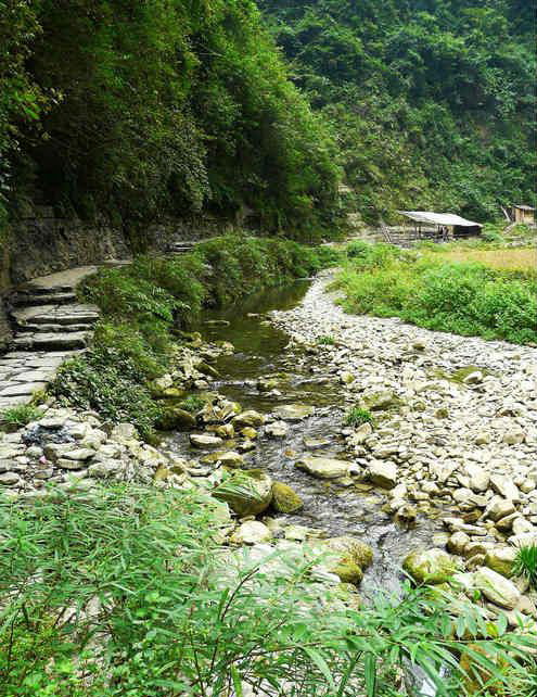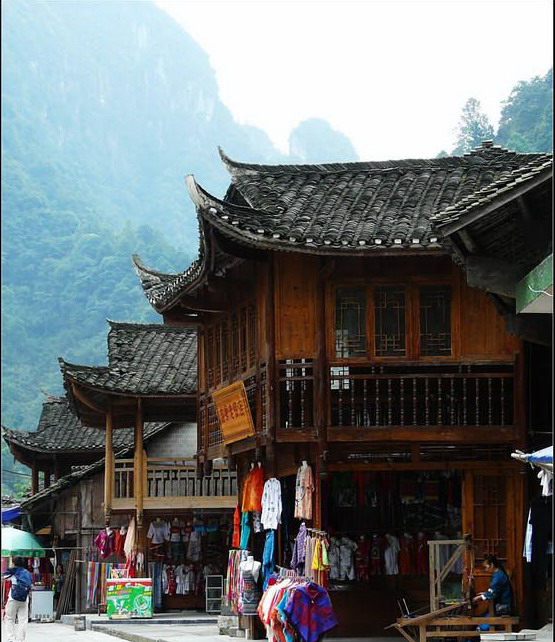 村寨四周山勢雄奇,絕壁夾天;“夯峽”、“九龍”、“玉泉”三溪在這里相會,如同三根彩帶在這里相交結(jié)。這里是風景區(qū)的中心,一萬五千多米長的青石板路從這里一直通向各個景點這里還是一個角度十分好的觀景臺,人立于此,只要原地轉(zhuǎn)動身子,就可觀賞到東西南北全方位的各個景點,那含情脈脈的“相依巖”、昂首奮蹄的“駟馬峰”、惟妙惟肖的“孔雀開屏”五彩繽紛的“彩云壁”和“畫屏峰”……盡在眼中無不景象萬千,令人目不瑕接。詩人石元機贊曰: