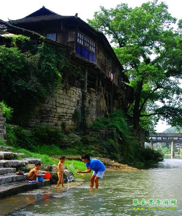 民宅多為吊腳木樓,依山傍水而建,臨河者倒影澄潭如水中街市,依山者雄峙高崖似空中樓閣。兩條河潔凈透亮,其中小河尤為美麗,青山夾岸,綠水長流,河畔蓼紅芷白,桂馥蘭芳,素有“香溪”之稱。其水盡來自溶洞,距街三里之內(nèi),就有魷魚洞、犀牛洞、王家洞、向家洞幾股洞泉和一個叫“雞屎潭”的溫泉。 “雞屎潭”來有濃重的硫磺味,水溫如沸,除污力極強,根本不需肥皂便能將汗?jié)n洗得干干凈凈,并能醫(yī)治瘡疥,維護皮膚健康。河中多魷魚,肉嫩且肥,立冬前盡逆水潛入溶洞起冬,立夏前兩三天則成群結(jié)隊隨夏汛而出,鄉(xiāng)人在洞口安上網(wǎng)壕,只需“守株待兔”,便能得到豐盛的收獲。在20世紀70年代以前,有時每天可得幾百斤。 小河灘多流急,是漂流的極佳去處。
