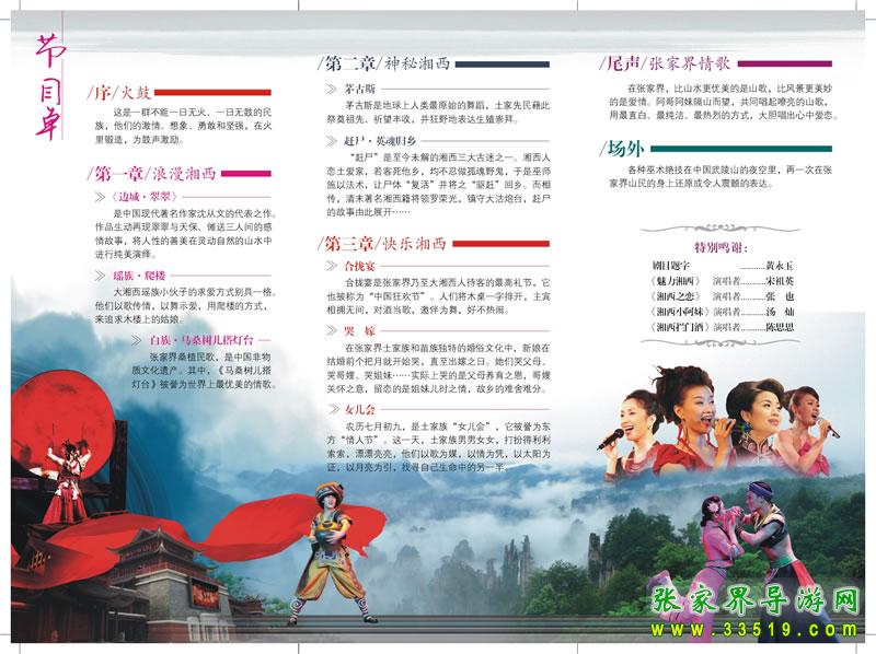 為將最好的張家界和大湘西的魅力呈現(xiàn)于世,“張家界·魅力湘西”的創(chuàng)作團隊,數(shù)年來走遍了張家界和大湘西地區(qū)近百個原始村寨,采風(fēng)、記錄、整理出湘西民族、民間、民俗文化形態(tài)和素材。10年來,“張家界·魅力湘西”成功將一大批民間藝人請出山寨、請上舞臺,使諸多隱匿深山、瀕臨失傳的張家界和大湘西“三民”文化活化石展現(xiàn)在舞臺上。
