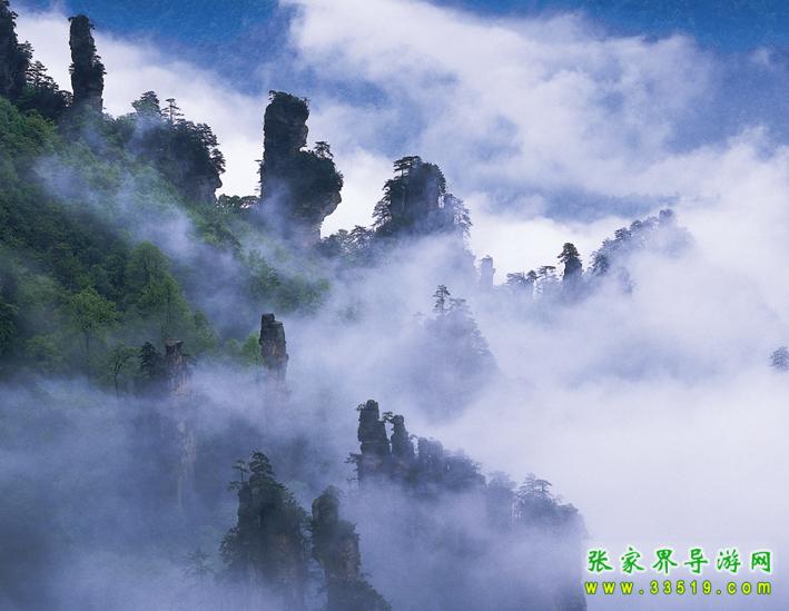 由于它地勢高,東南西三面都可觀景,透視線長,畫面寬闊,景觀層次多。在天子山的天子峰或七星山上居高臨下,俯瞰腳下成千的感受。天子山山體中部高,四周低,似一座巨型寶塔拔地而起。各類新發(fā)育的造型奇特的地貌,多集中天子山山腰, 如雄偉的瀑布、奇險的仙 人橋、巖門、溶洞,密集而陡峭的峰林石柱等,又使游人的獵奇心得到最大的滿足 。