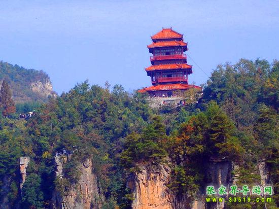 這是六層四重檐穿頭式仿古建筑,高30米,由深圳市政府捐建。建立之初,本打算取名叫“深圳閣”,但遭到許多人(包括深圳人)反對,認為這樣與整個天子山的風景不是很協(xié)調(diào)。不過從另一個角度來看,深圳人這種“經(jīng)營城市”的意識,卻非常值得張家界人學習。“欲窮千里目,更上一層樓”,登樓遠望,天子山群峰盡收眼底,別有一番風景。