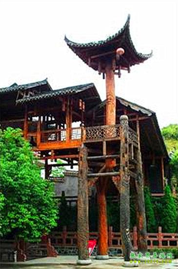 這棟樓高48米,9重12層,分三層天、三層地、三層水,所以叫九重天。全樓依山而建,為純木結(jié)構(gòu),沒有用一顆鐵釘,是目前世界上最高的一棟吊腳樓。有人這樣寫道:“層層樓閣層層天,樓中游人賽神仙,君惹欲知迷宮樂,興步漫攀九重天。”