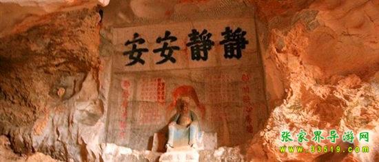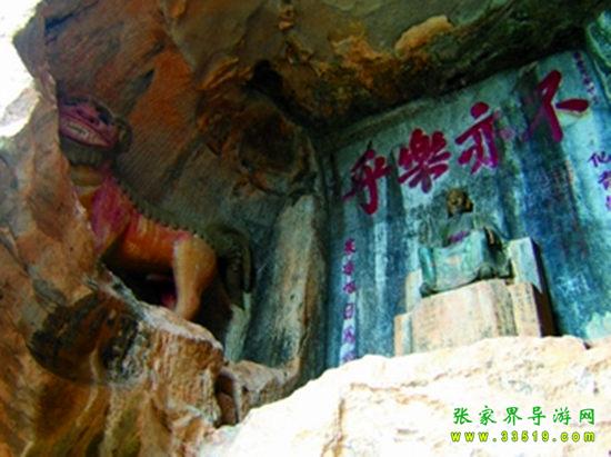 玉皇洞石窟位于張家界城西約7公里的麻空山南壁,為清代本地鄉(xiāng)紳李京開獨(dú)資捐修。李京開又叫李五瑞,別名九洞樂,號(hào)識(shí)破生。他生于乾隆七年(公元1742年),道光乙酉年(1825年)去世,享年83歲。李先生家道殷實(shí),富甲一方。少時(shí)勤奮讀書,頗有才華,數(shù)十年奔波仕途,但屢試不第,官場(chǎng)無(wú)望,于是看破紅塵,另尋安慰,請(qǐng)工匠,耗巨資,憑借麻空山天然溶洞,按上、中、下方位布局,巧妙構(gòu)思,開鑿成“天堂”、“人間”、“地府”三層共八個(gè)洞。另外,在離此約3公里的峰泉洞另鑿一洞,故有“九洞樂”別名。玉皇洞石窟上層為玉皇洞,人間層有玉金洞、毫筆洞、墨池洞、虎龍洞、雄獅洞、孔圣洞,地府為因果洞,八洞組成一個(gè)完整的混沌世界。居八洞之首的玉皇洞,雕有玉皇大帝神像,意為“天堂”至尊,統(tǒng)帥中層的“人間”和下層的“地府”,故八洞統(tǒng)稱玉皇洞。此洞于1799年動(dòng)工,到1807年完成,歷時(shí)八年。洞內(nèi)雕鑿了一些歷史人物的神像以及大量詩(shī)詞匾對(duì),不僅石雕精湛獨(dú)特,雕像神韻生動(dòng),書法遒勁大氣,而且在石窟藝術(shù)的主題構(gòu)思上,抒發(fā)了主持捐修者李京開懷才不遇、憤世疾俗、向往太平盛世的情感,鞭達(dá)了腐朽的科舉制度,對(duì)于研究清代社會(huì)和科舉制度,以及當(dāng)時(shí)一般讀書人的思想情感,都具有一定的史料價(jià)值。整座洞窟東西長(zhǎng)300余米,現(xiàn)存石像19尊,石刻50多處,是湖南省唯一保存完好的石窟藝術(shù)群,1959年玉皇洞被列入湖南省重點(diǎn)文物保護(hù)單位。