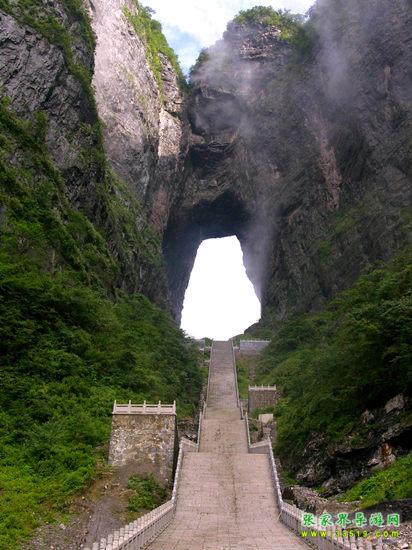 天門洞位于天門山山體的中上部,是世界上最高海拔的天然穿山溶洞,海拔1300米 ,其高131.5米,寬57米 ,深60米。它南北對(duì)開于千尋素壁之上,扶搖而通天,似明鏡似天門鑲嵌于蔚蔚天幕之上,終年吞云吐霧,蔚為壯觀中更加神秘莫測(cè)。“天門洞開云氣通,江東峨眉皆下風(fēng)”元朝的著名詩人張兌曾這樣贊嘆,磅礴的氣勢(shì)由此可見。1700多年來,這一道奇絕天下的勝景吸引著無數(shù)的探訪者趨之若騖。特別是在1999年,世界特技飛行大師架機(jī)穿越天門洞,在全球引發(fā)了轟動(dòng)效應(yīng),收看現(xiàn)場(chǎng)直播的觀眾達(dá)到8億之多。