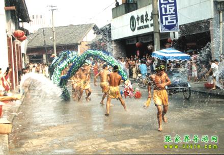 張家界潑水龍又叫“澆水龍”,于唐朝時期由移居本地的白族興起演變而成,在永定區(qū)的尹家溪鎮(zhèn)西尹村、莫家崗村十分盛行,是當(dāng)?shù)?a class="insidelink" href="http://www.danublue.com/fengqing/" title="土家族">土家族,白族、苗族在天熱干旱時節(jié)求雨祈福的一種形式。一旦出現(xiàn)旱災(zāi),當(dāng)?shù)仡^面人物就會出來組織潑水龍,演出極其隆重。