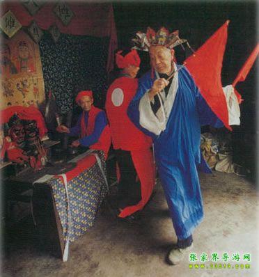 儺戲在湘西土家族地區(qū)也稱儺堂戲、儺神戲,它與土家族原始巫教、巫術(shù)的關(guān)系極為密切。土家族先民信奉的神有儺神、八部大神、土地神等,作為一種宗教活動(dòng),這種原始信仰與社會(huì)生產(chǎn)活動(dòng)、文娛活動(dòng)及民族習(xí)俗是融為一體的,因此儺戲最先的“沖儺還原”帶有明顯迷信色彩,土家族群眾中有“一儺沖百鬼,一愿了千神”的說(shuō)法,湘西土家族人干脆叫它為“神戲”。湘西土家族儺戲的發(fā)展過(guò)程大體是儺、儺舞、儺儀然后才產(chǎn)生儺戲。儺舞源于久遠(yuǎn)的蒙昧?xí)r期,土家先民們?cè)谕笞匀蛔鞫窢?zhēng)、同毒蟲猛獸作斗爭(zhēng),便產(chǎn)生了化裝護(hù)面、在鼓樂(lè)聲中奔騰呼號(hào)、沖殺跳躍的原始儺舞,其所模擬的鳥雀舞、猿猴舞、熊舞等頗為壯觀。儺舞與儺這種驅(qū)鬼消災(zāi)的祭祀儀式結(jié)合后,增加了祈求人獸平安、五谷豐登、緬懷祖先、勸人去惡從善、以及傳播生產(chǎn)知識(shí)等內(nèi)容,這就逐漸形成了兼?zhèn)潢U弘教義及娛樂(lè)性質(zhì)的祭祀風(fēng)俗歌舞。[2]土家族儺戲就是在此基礎(chǔ)上發(fā)展起來(lái)的。部分土家族學(xué)者認(rèn)為土家族儺戲的遠(yuǎn)源可以追溯到戰(zhàn)國(guó)時(shí)代的《九歌》,《九歌》是土家族儺戲的雛形,他們的依據(jù)是當(dāng)時(shí)楚國(guó)的沅湘流域,人們“信巫鬼、重淫祀”(《漢書·地理志》),從而使得“陰陽(yáng)人鬼之間,又或不能無(wú)褻慢淫荒之雜”(宋代朱熹《楚辭集注》)。屈原正是加工整理了這一類“鄙陋”之詞,才創(chuàng)作出《九歌》、《天問(wèn)》等名篇。也有部分學(xué)者不贊同這種論點(diǎn),他們認(rèn)為土家族儺在宋代還停留在儺祭和儺舞階段,最遲到明代,土家族儺才發(fā)展成為儺戲[3]。嘉靖《常德府志》記載:“歲除,歲將盡數(shù)日,鄉(xiāng)村多用巫師,朱裳鬼面,鑼鼓喧舞竟夜,名曰還儺。”文中未點(diǎn)明“儺戲”二字,但卻使用了“還儺”一詞,這與今天民間對(duì)儺戲的稱呼相似。又據(jù)清乾隆《永順縣志》載:“永俗酬神,必延辰郡巫師唱演儺戲,……至晚,演儺戲。敲鑼擊鼓,人各紙面一,有女裝者,曰孟姜女;男扮者,曰范七郎。”在土家族儺戲中,孟姜女傳說(shuō)故事占著非常重要的地位。在湘西土家族地區(qū),儺戲一般有二十四正戲,即二十四戲神。每次儺儀結(jié)束時(shí),巫師要用香火在黃裱紙上燒二十四個(gè)洞,以表示奠祭二十四戲神。民間有諺語(yǔ):“儺神菩薩不識(shí)字,只要二十四個(gè)圈圈滿。”在二十四儺神中,被稱為勾愿神的姜女、范郎是還儺愿時(shí)非常重要的兩位神靈。在儺戲中,《孟姜女》是整場(chǎng)的高潮,平時(shí),儺戲唱完后,由沒(méi)下裝的孟姜女、范郎去向主人家及觀眾“拜臺(tái)”,以示“了愿”。清代中期以后,儺戲吸取了花燈、陽(yáng)戲、高腔等其他地方戲劇劇種的唱腔和劇目,逐漸變得日益成熟。我們仔細(xì)查看了全國(guó)371個(gè)劇種,發(fā)現(xiàn)儺戲、花燈戲有著相同的班社,也就是說(shuō)一個(gè)演出班社可以演出儺戲、花燈戲兩個(gè)劇種。這段時(shí)期,儺戲已作為獨(dú)立戲劇劇種參加演出。由于儺戲是由巫儺法事演變而成的戲劇形式,經(jīng)歷著巫儺法事(驅(qū)鬼祭祀)、儺壇上戲和儺堂正戲的發(fā)展過(guò)程。