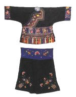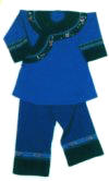 據(jù)史載,有關(guān)土家族的服飾宋代稱“溪布”、“峒布”、“土錦”等。后受漢族先進(jìn)技術(shù)影響,土家人用自織自染的“土布”做成圍裙。到現(xiàn)代,土家服飾發(fā)生了巨大變化,但仍保留了許多傳統(tǒng)樣式。土家族人始終著以琵琶襟為特征的滿襟衣。托肩矮領(lǐng)大袖口,滾花邊。男捆腰帶,女套繡花圍裙。頭上均包青布帕或絲帕,男帕左方垂一節(jié)過耳,婦女全包頭。未婚閨女留長發(fā)扎辮,用紅頭繩扎上下兩端,額前前留“劉海”。已婚婦女挽上發(fā)管,別簪,插銀首飾。褲子多為青、藍(lán)色、上結(jié)白布褲腰,褲腳短且大。青壯年男子打綁腿,女褲以對襯色布加邊,上綴三條均等的梅花條,腳上穿青布瓦鞋,包白色裹腳布。若遇喜慶節(jié)日或走親訪友,則另有一番梳妝打扮,如加佩牙簽、銀牌等。