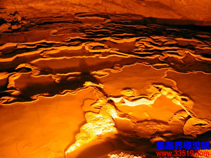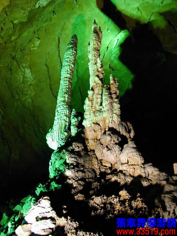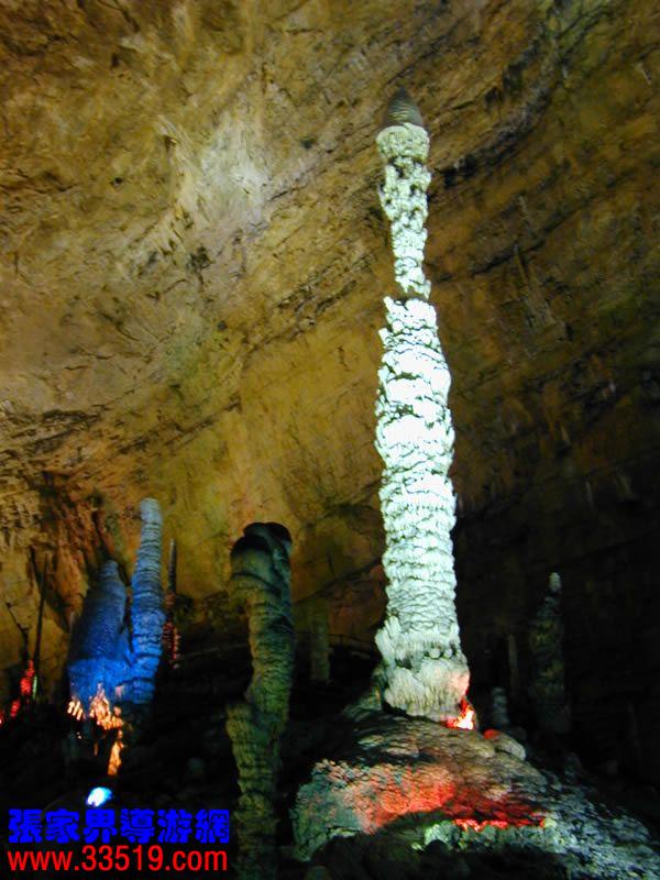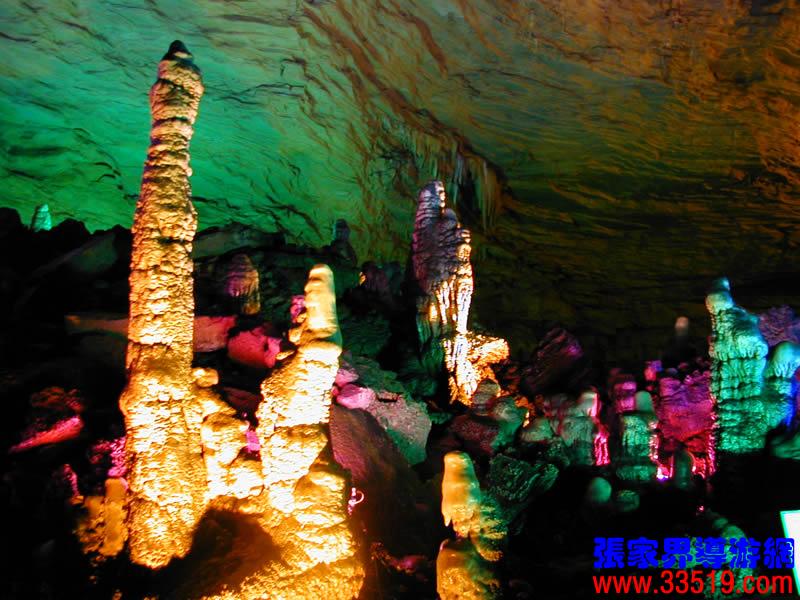 (龍宮)龍宮是黃龍洞十三個(gè)大廳中最大的一個(gè),也是景色最美的景點(diǎn)之一,底面積15000平方米,平均高40米,兩千余根石筍拔地而起,千姿百態(tài),異彩紛呈,或如飛禽走獸,或如宮廷珍藏,有的像巍巍雪松,有的像火箭升空。龍宮后園有金銀兩座花池,清水常溢,花簇盛開。宮頂鐘乳柳垂簾掛,四周壁栩栩如生。溶解著各色各樣的礦物質(zhì)的水,從巖層中滲透出來,滴落下來。礦物質(zhì)在洞頂凝固結(jié)晶成倒懸鐘乳石,從鐘乳石滴落的水又把礦物質(zhì)澆疊、堆壘在洞底,而長成節(jié)節(jié)向上的石筍。大家看看這龍宮的造型,領(lǐng)略這磅礴的氣勢。洞內(nèi)最大石筍,高12米、直徑10米的漢白玉天然石椅“龍王寶座”居高臨下,眾多石柱石筍似人似物,維妙維肖,圍著寶座朝拜山呼,幾十座珊瑚亭亭玉立,儼然一支龐大的“宮廷樂隊(duì)”。湖南著名教授羊春秋先生作《寄生草》詞對此進(jìn)行描繪:“百態(tài)千姿模樣,三宮六院門巷。龍王開宴設(shè)瓊漿,猴王偷果鬧天堂,君王納寵擁羅帳。搬演了人間爭攘,匯集了天下奇觀。”