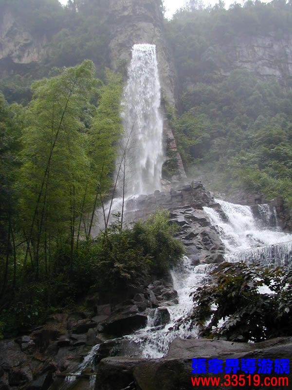(聽瀑樓)朋友們,寶峰湖游結(jié)束了,大家一路辛苦了。現(xiàn)在,我提議到“聽瀑樓”歇歇腳,洗洗汗,聽聽音樂,養(yǎng)好精神再趕路。你們看這民族式建筑,背依砂巖石峰,面朝寶峰飛瀑,登斯樓也,品土家之香茶,聽瀑布之濤聲,此情此景,怎不令人感嘆人與自然傾心交談的空靈境界?