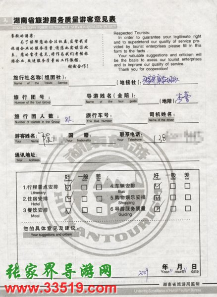 2009年11月11日陳先生一行8人旅游接待質量反饋單: